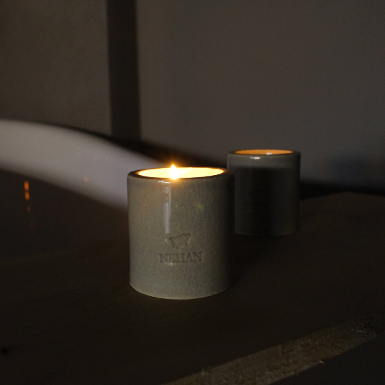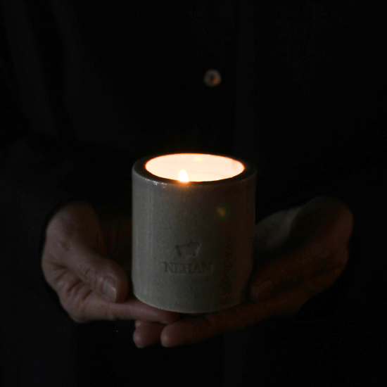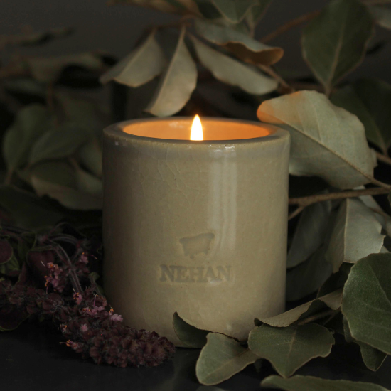 夜をやわらかに演出する炎と影の揺らぎ。天然由来のソイワックス。NEHANがセレクトした3種類の香りのアロマキャンドル。マグネシウム釉薬で焼き上げられた蓮池の水面を想わせる淡いブルーグリーンの器。