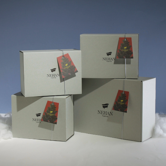 NEHANギフトBOX(グレー)S(クリスマスタグ付き)に商品をお入れし、発送用段ボールに入れて発送いたします。